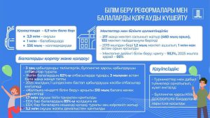 ➤ Буллингке қарсы күрес жүргізілуде. Сондай-ақ, әкімшілік жауапкершілік белгіленді. Күрес шаралары аясында финдік Kiva және отандық ДОСБОЛLiKe бағдарламалары жұмыс істейді, «Кибер Тұмар» және «Ата-ана бақылауы» науқандары өткізіледі, «Менің бауырым» жобасы іске асырылуда.